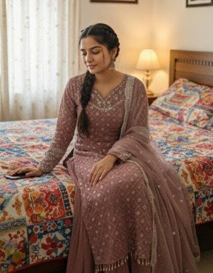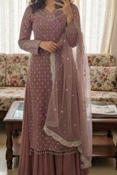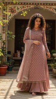 Shine with elegance in this blush pink georgette embroidered kurta set, paired with matching palazzos and a soft organza dupatta. Styled with delicate floral embroidery, tassel accents, and long sleeves, this outfit brings grace and sophistication to festive and wedding occasions. Its A-line fit and lightweight fabric make it perfect for long celebrations while keeping you comfortable and stylish. Available in sizes M to XXL for the perfect fit.