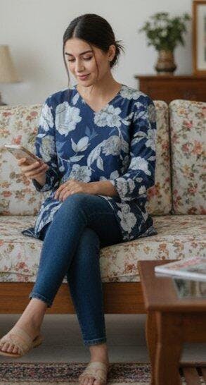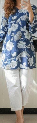 Stay stylish and comfortable with this navy blue printed short kurti made from soft rayon fabric. Designed with a modern V neckline, long bell sleeves, and a 30-inch length, it offers a chic and trendy appeal. Perfect for pairing with jeans, trousers, or skirts, this kurti is ideal for casual outings, office wear, and everyday style. Available in sizes XS to XXL for the perfect fit.