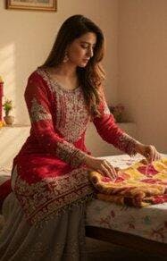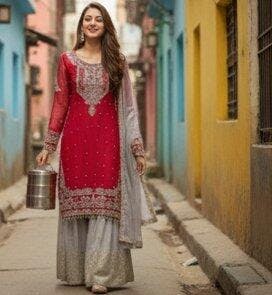 Elevate your festive and party look with this stunning maroon georgette kurta set paired with matching sharara and a contrasting cream dupatta. Featuring intricate embroidery, floral prints, and elegant three quarter sleeves, this A-line kurta adds a touch of sophistication to your style. Perfect for weddings, celebrations, and special occasions, the lightweight georgette fabric ensures comfort while keeping you effortlessly graceful. Available in sizes M to XXL for a perfect fit.