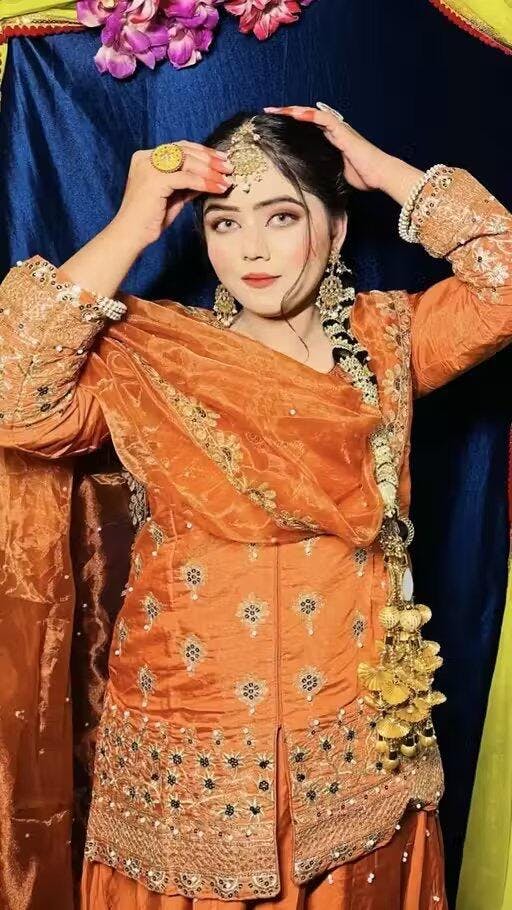 Make a grand style statement with this stunning orange lehenga set crafted from premium silk. The richly embellished top features delicate bead and stone work paired with a ready-to-wear silk lehenga for effortless elegance. A sheer net dupatta with intricate embroidery completes the look, making it perfect for weddings, festive celebrations, and special occasions. Designed in a Bollywood-inspired style, this set beautifully combines traditional charm with modern glamour. Available in multiple sizes for the perfect fit.